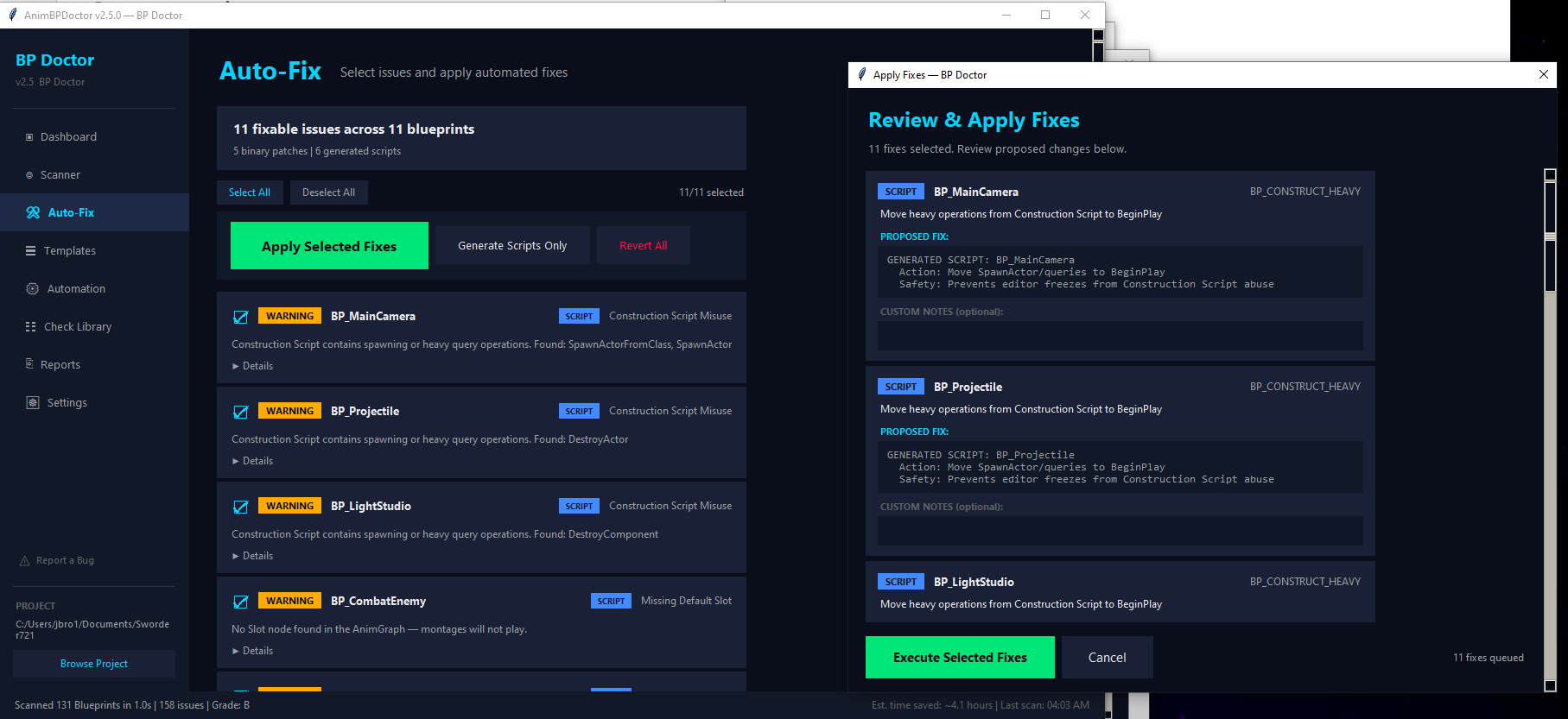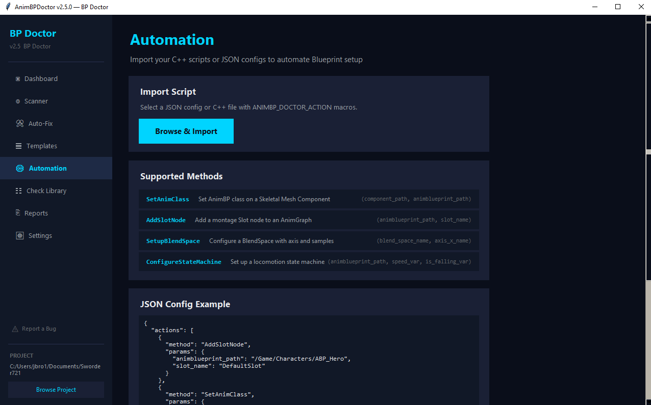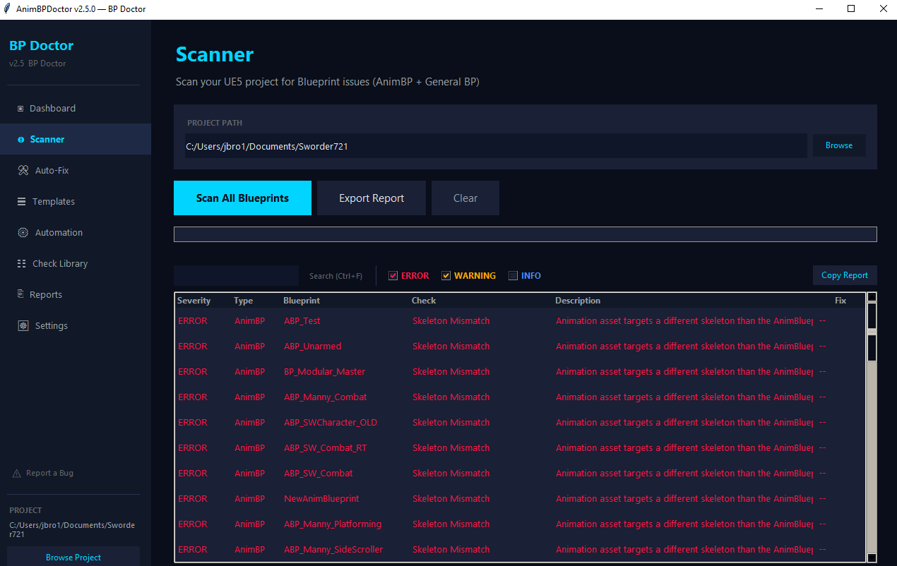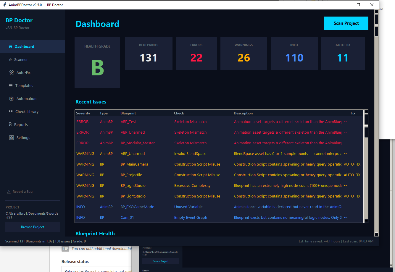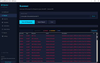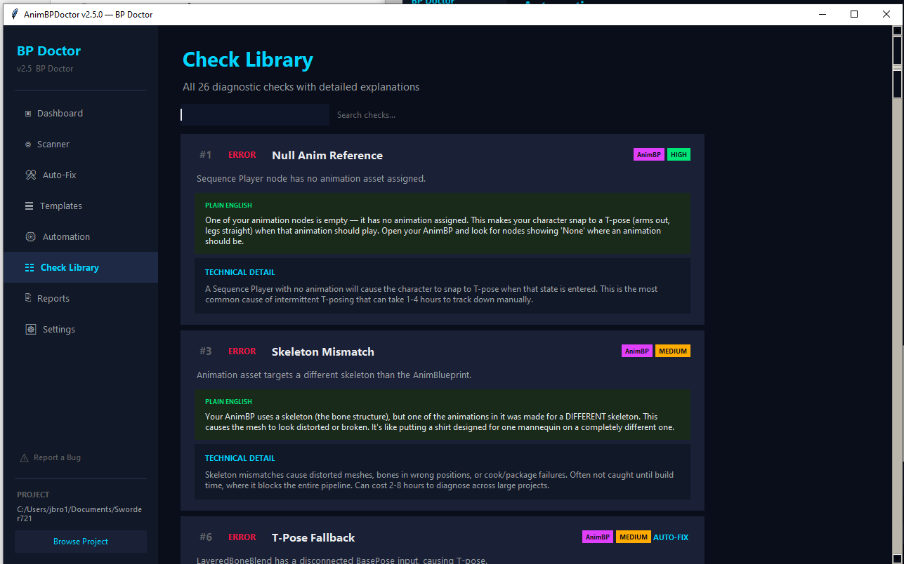 AnimBP Doctor scans your UE5 Blueprint files raw — no editor, no plugins, no dependencies. One exe, point it at your project, and in under a second it runs 26 checks that catch the stuff that wastes your afternoon: T-pose bugs, broken references, skeleton mismatches, dead states, tick performance bombs, hard ref bloat, debug nodes you forgot to delete.